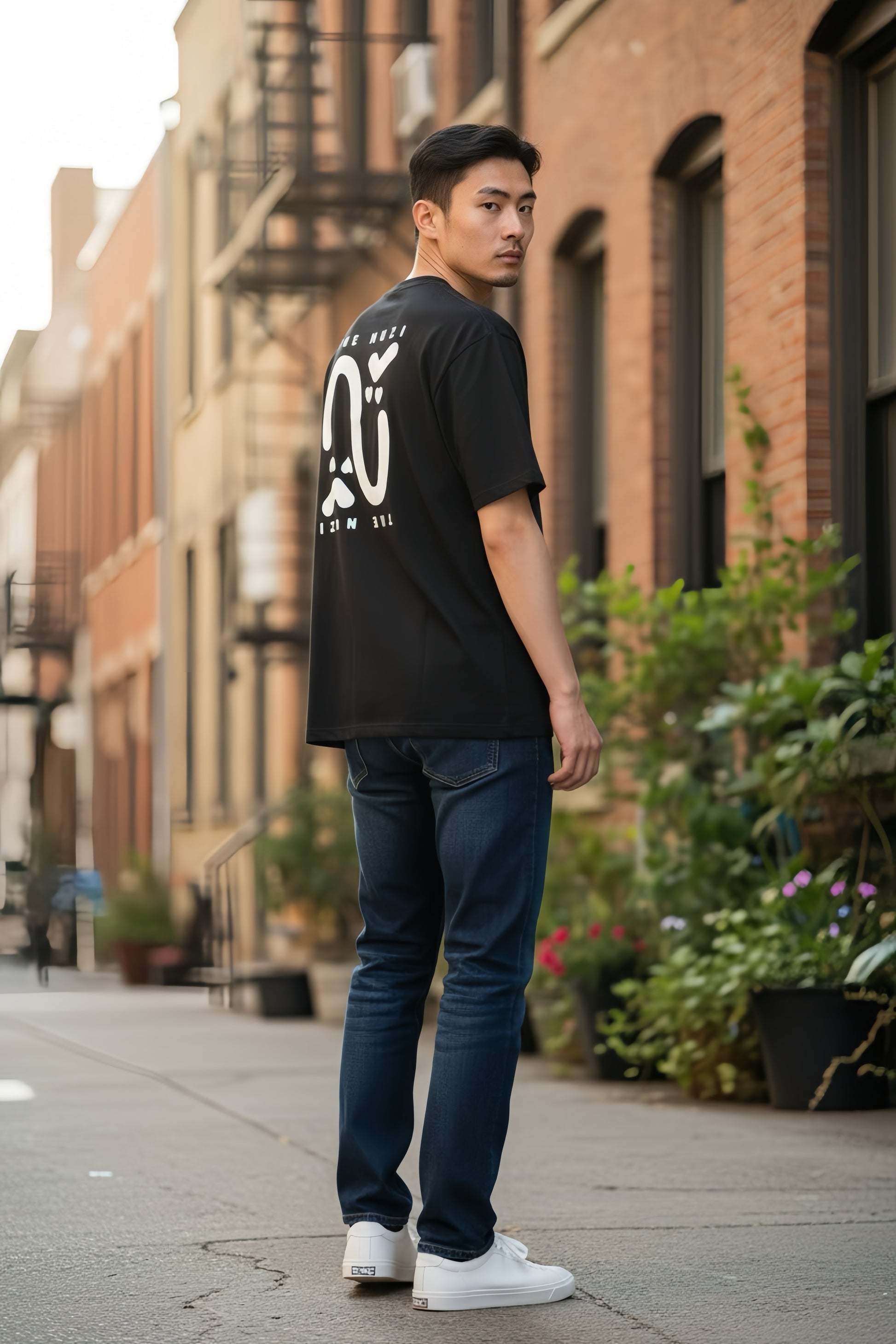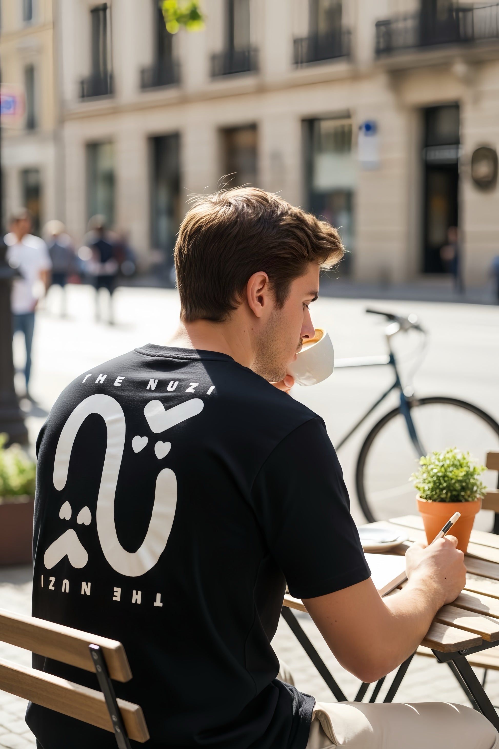 ON THE BACK IS THE NUZI TRADEMARK LOGO SCREEN PRINTED ON THE TOP CENTER OF THE T-SHIRT, REIMAGINED WITH HEART-SHAPED EYES FOR THIS SPECIAL EDITION RELEASE.