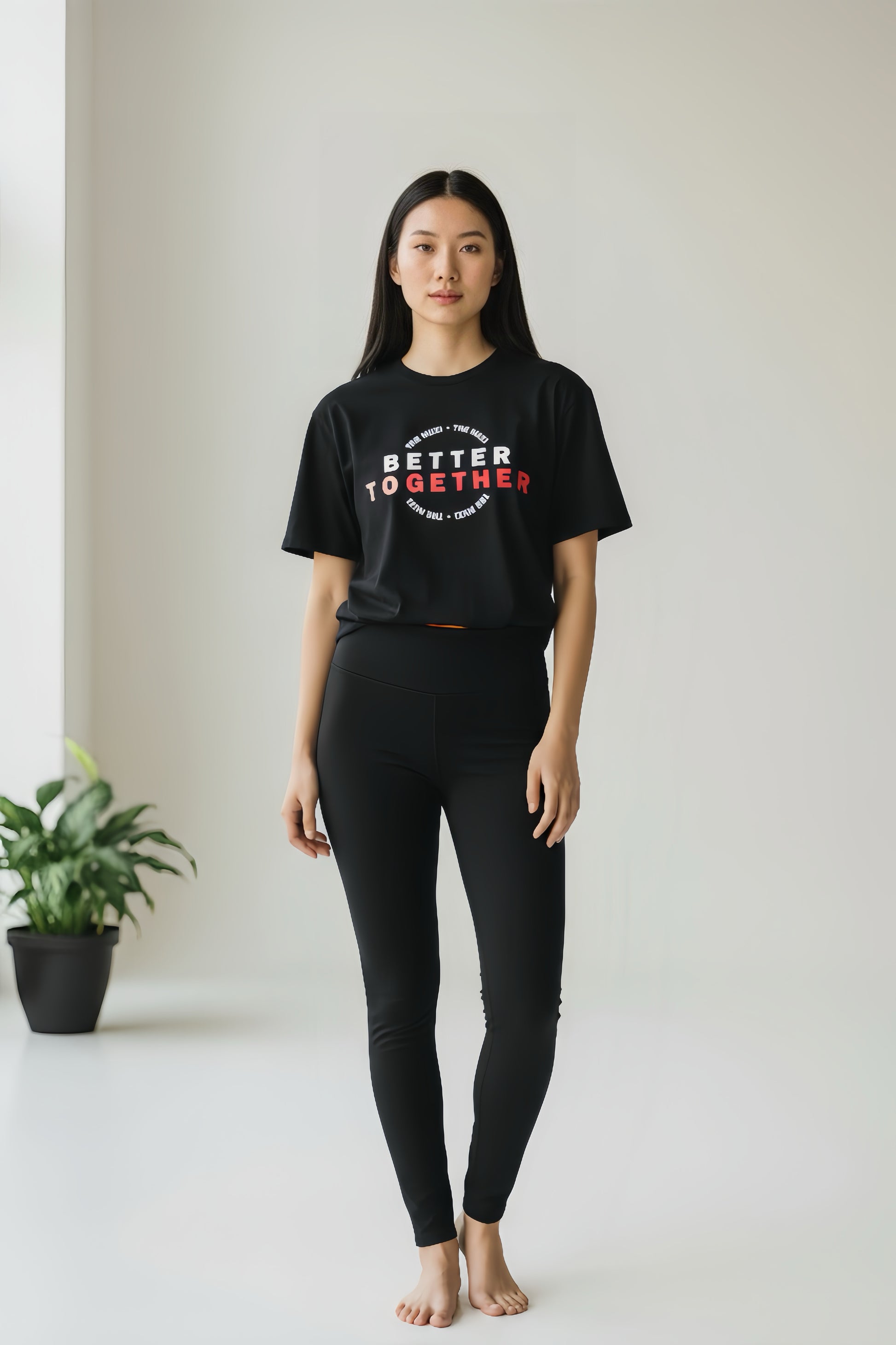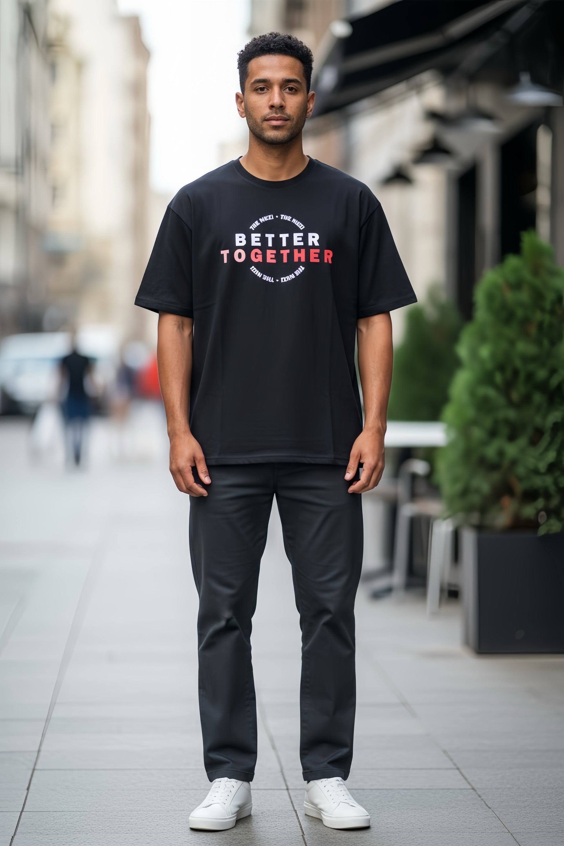 THIS T-SHIRT FEATURES “BETTER TOGETHER” SCREEN PRINTED ON THE FRONT, WITH TO-GET-HER HIGHLIGHTED IN A SUBTLE GRADIENT AS A PLAY ON WORDS.